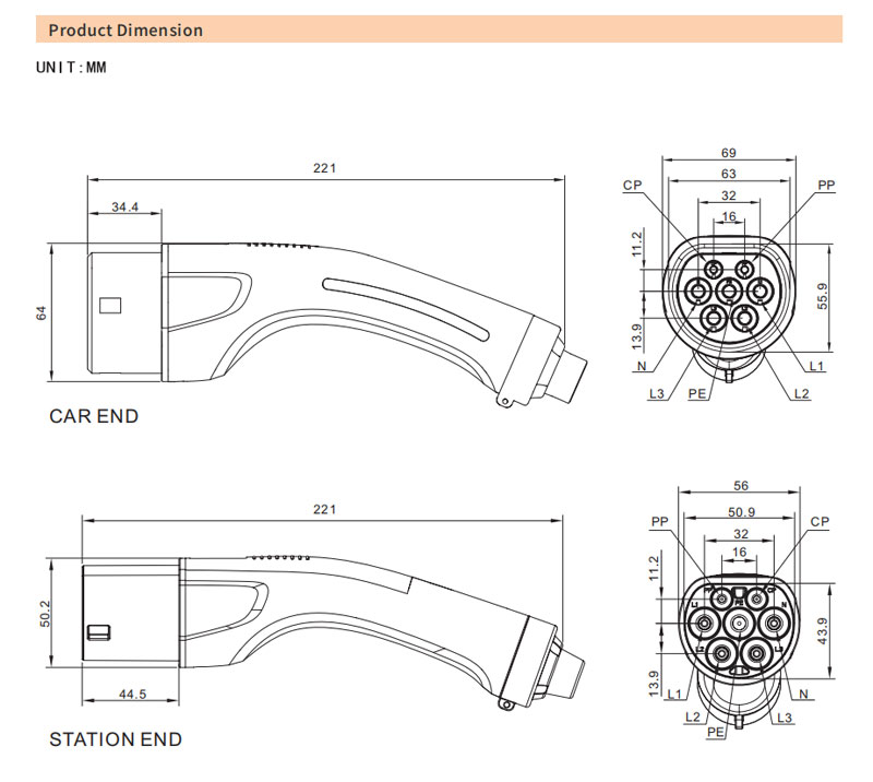 The product conform to IEC62196-1, IEC62196-2 European standard and SAEJ1772-2010 American standard.